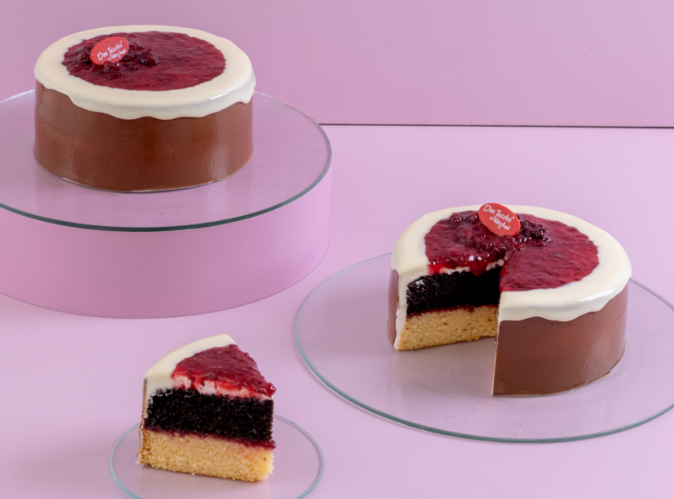Torta de vainilla y chocolate unidas con salsa de mora, cubierta con crema de vainilla-chocolate y un espejo de salsa de mora.